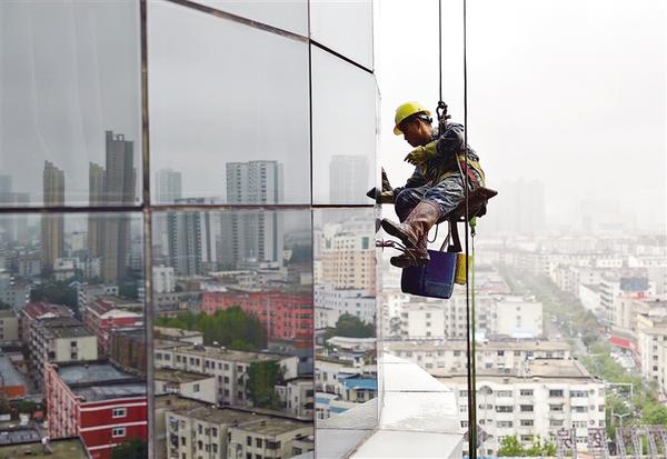 近日,一名“蜘蛛人”在中心城區(qū)一座大樓的外墻面認真作業(yè),為城市的美麗和整潔貢獻著自己的力量。 段繼軍 攝