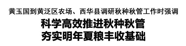本報(bào)訊 (記者 王艷) 11月11日,市委書記黃玉國(guó)到黃泛區(qū)農(nóng)場(chǎng)、西華縣調(diào)研秋種秋管工作。他強(qiáng)調(diào),要深入學(xué)習(xí)貫徹習(xí)近平總書記關(guān)于“三農(nóng)”工作的重要論述和在河南考察時(shí)重要講話精神,堅(jiān)決扛穩(wěn)扛牢糧食安全責(zé)任,科學(xué)高效推進(jìn)秋種和田間管理,確保種足種好小麥,為明年夏糧豐收奠定堅(jiān)實(shí)基礎(chǔ)。