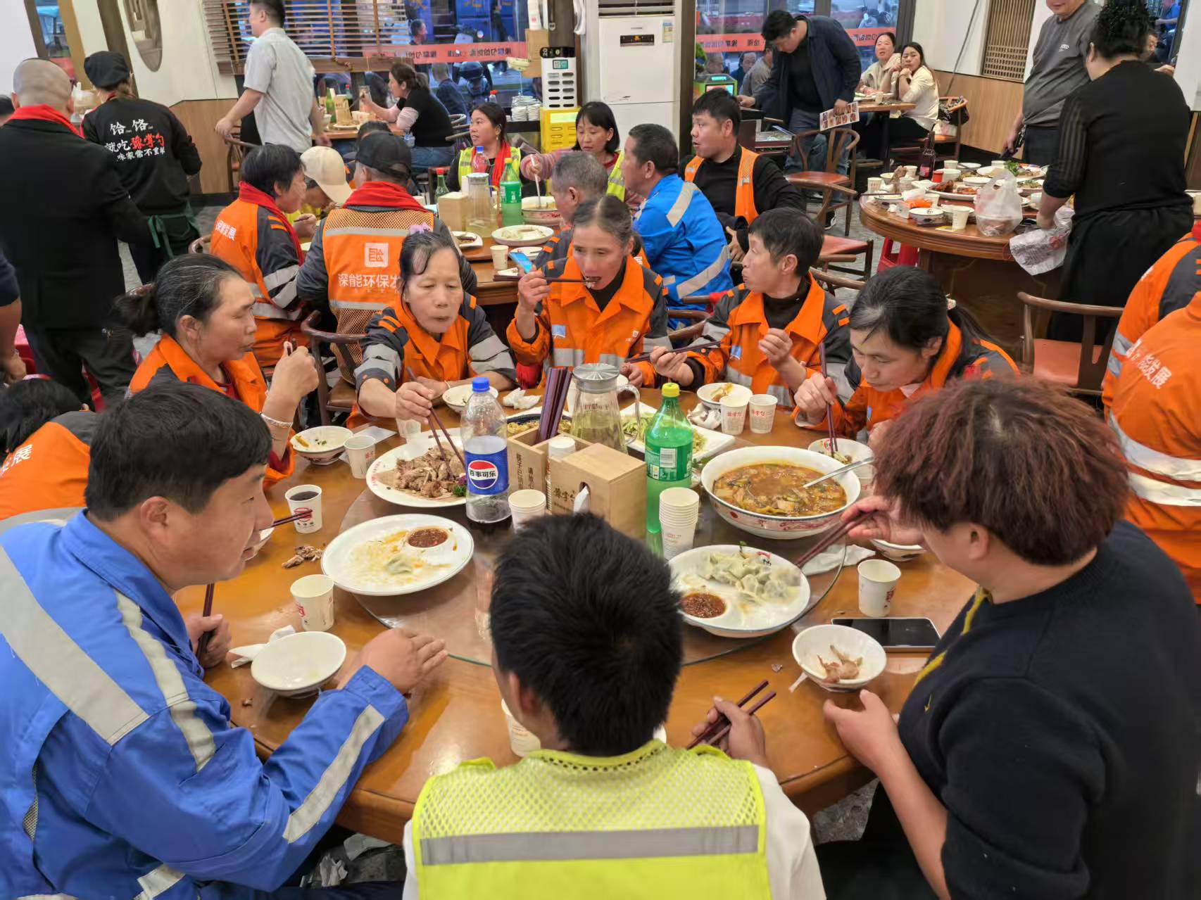 活動當天,剛剛結束清掃工作的“城市美容師”們身穿工服陸續(xù)抵達。張高鵬早已在門口迎接,熱情問候每一位工人并送上新春祝福。席間,道口燒雞、五香牛蹄筋、酸菜魚等十多道佳肴相繼上桌,暖意融融的用餐氛圍中,歡聲笑語不斷,如家人般親切溫馨。