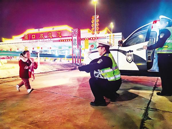 萬家團(tuán)圓共慶佳節(jié),警燈閃爍守護(hù)平安。2月16日除夕之夜,在寧洛高速公路周口段巡邏任務(wù)結(jié)束之際,周口市公安局高速公路交通警察支隊(duì)一隊(duì)民警趙軒,迎來了前來探望拜年的女兒。