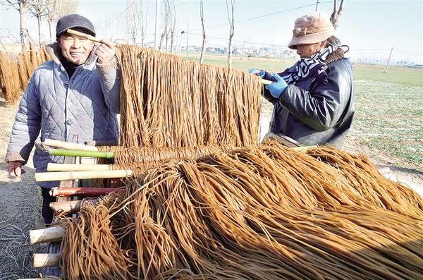 1月12日,商水縣練集鎮(zhèn)農(nóng)民趁著晴好天氣晾曬粉條。作為當?shù)貍鹘y(tǒng)優(yōu)質(zhì)農(nóng)產(chǎn)品,紅薯粉條是百姓餐桌上必不可少的美食。